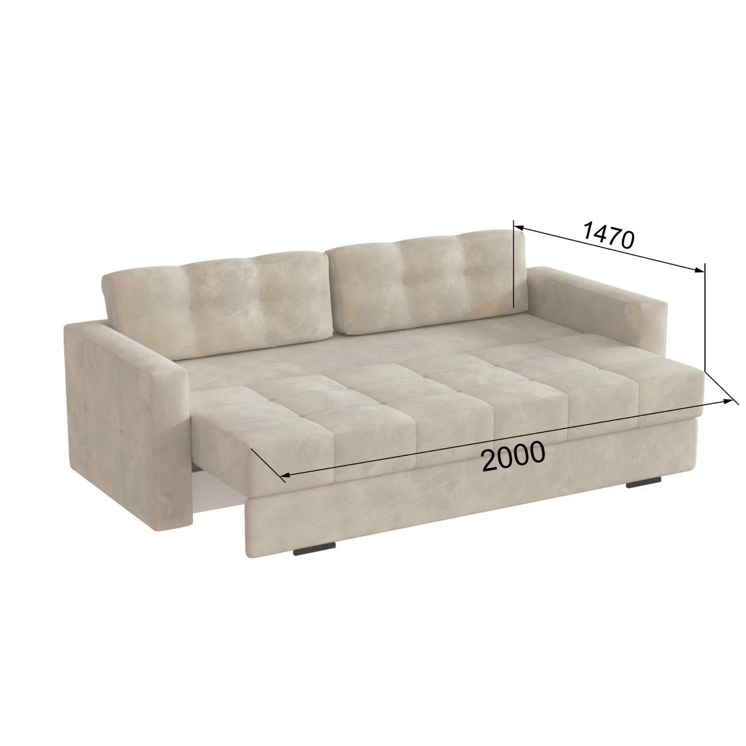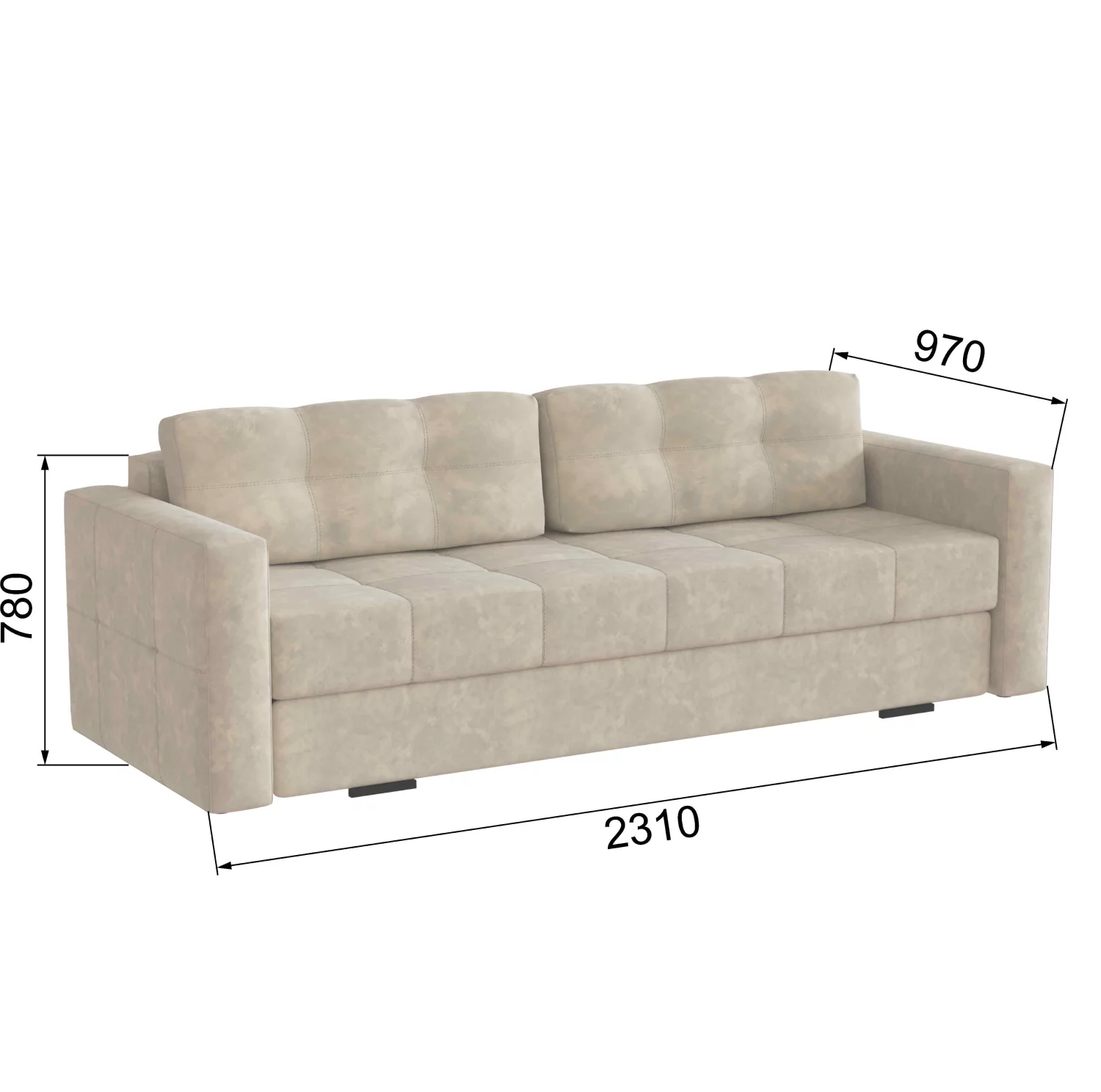 Габаритные размеры: (Ш*В*Г) 2190*1000*900 мм Спальное место: (Д*Ш) 1950*1440 мм Высота от пола сидения: 490 мм Ширина боковин: 120 мм Высота с подушками 1000 мм без подушек 700 мм. Ткань микровелюр (бежевый форест) или серый блисс Каркас дивана: сухой брусок хвойных пород, ЛДСП, фанера. Ящик для белья: ЛДСП, ДВП. Ножки АВС пластик черные. Механизм трансформации: шаговый «тик-так». Наполнение: Пружинный блок «Бонель», спанбонд, ППУ. (пенополиуретан). Чехол на диван и на подушки мебельная ткань микровелюр, прошитая с халконом и спанбонд.