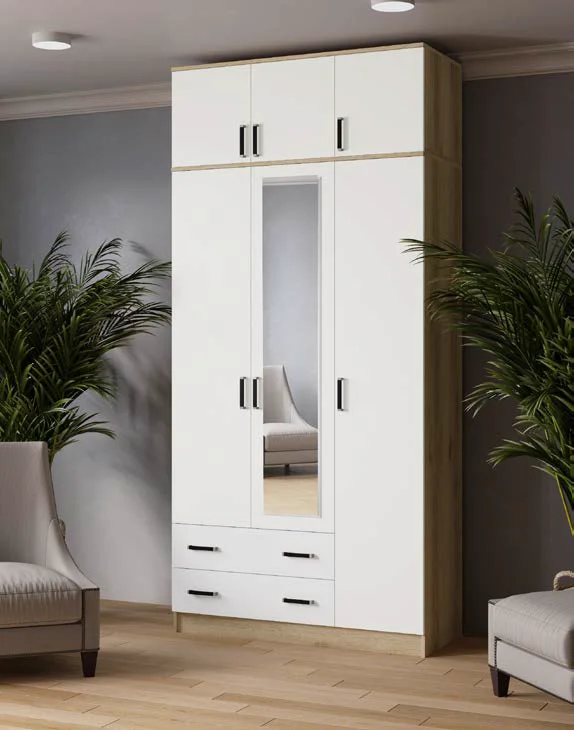 Шкафы шириной 1200 мм - комбинированные, есть отделение с полками для вещей и стационарная штанга для одежды.