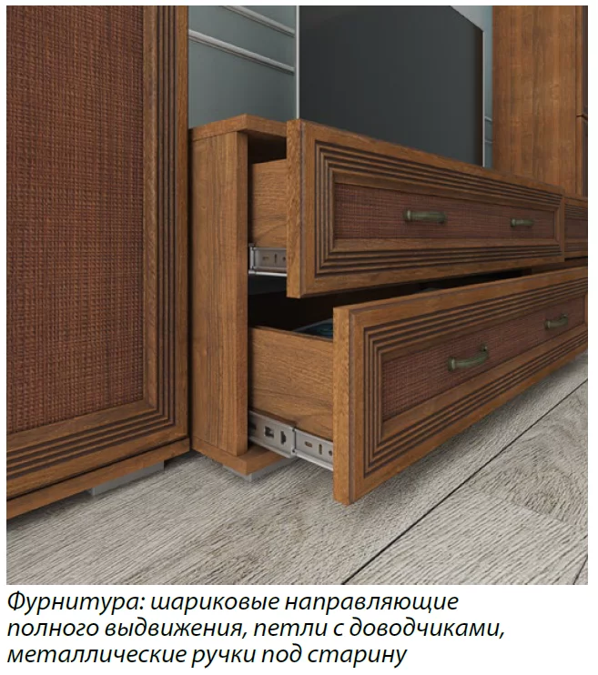 Гостиная будет украшена длинной тумбой для ТВ, занимающей центральное место. Тумба снабжена шариковыми направляющими для полного выдвижения, что позволяет использовать полезную площадь всех четырех ящиков. Товар поставляется в разобранном состоянии.